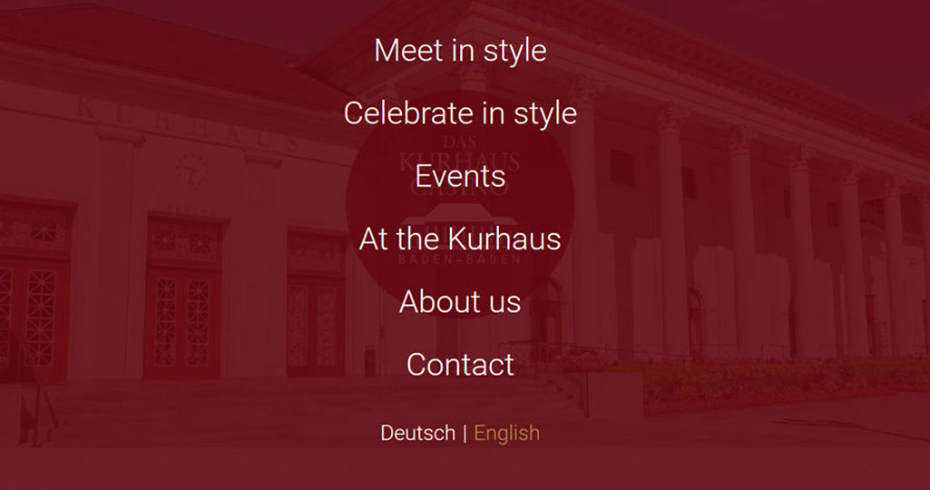 Die englischen Seiten sind analog zu den deutschsprachigen Seiten aufgebaut und enthalten – benutzerfreundlich konzipiert und für alle Endgeräte optimiert - sämtliche Text- und Bildinformationen rund um das KurhausCasino. Die optisch und inhaltlich attraktiv gestaltete Internet-Präsentation informiert die Nutzer ausführlich über Geschichte und Gegenwart des Hauses, über die Veranstaltungsräume und deren Möglichkeiten sowie über die Angebote „Schöner tagen“ und „Schöner feiern“. Ein Kontaktformular ergänzt den Web-Auftritt der Bäder- und Kurverwaltung Baden-Württemberg (BKV) für das KurhausCasino Baden-Baden.